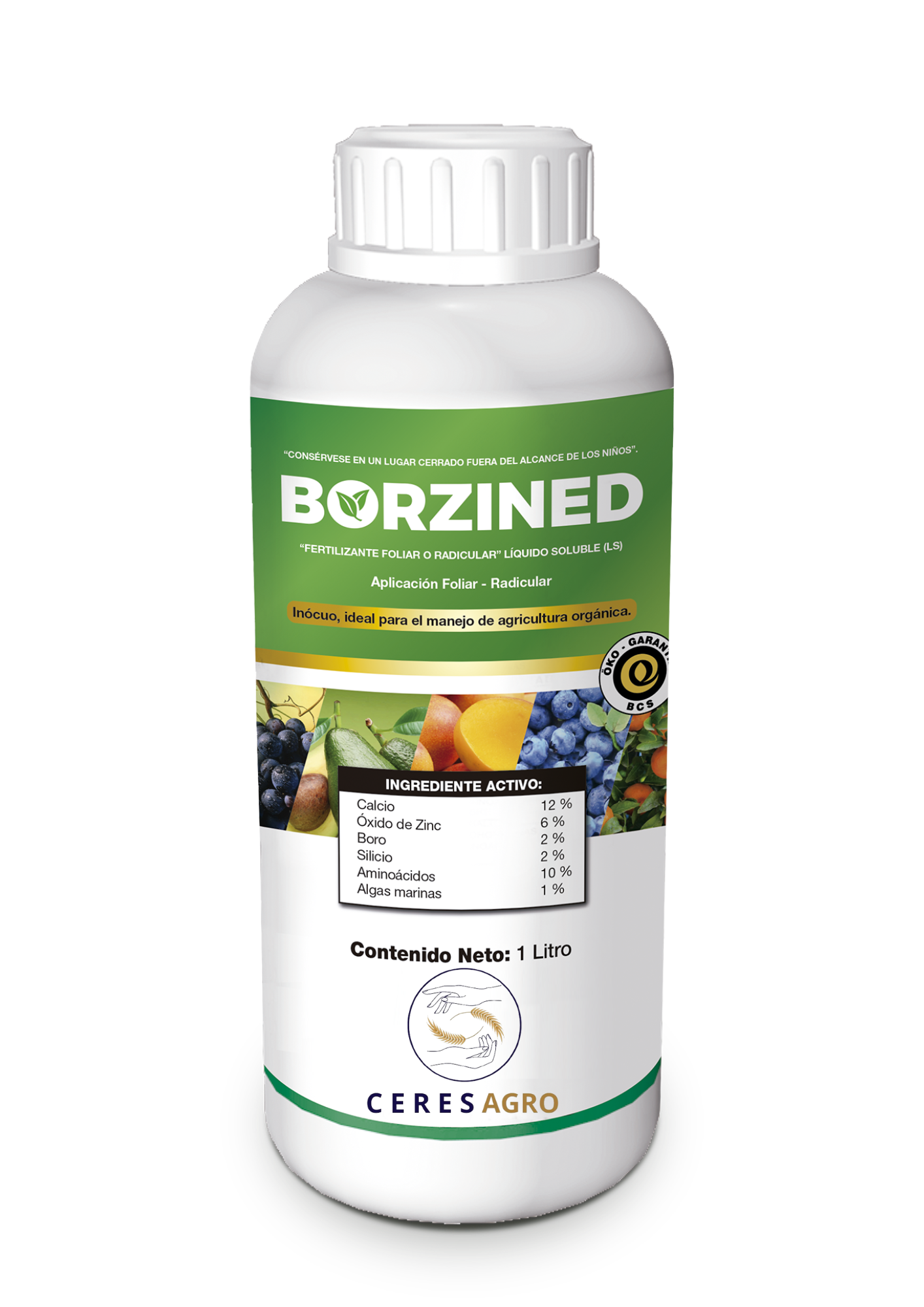Fertilizante foliar y radicular, a base de Óxido de Boro con 2%, Calcio 12%, Zinc 6%, Silicio 2%, Aminoácidos 10% y Algas Marinas con 1% de concentración, los aminoácidos movilizan al elemento por todo el interior de la planta. Ideal para ser aplicado en las etapas de pre-floración y floración en cualquier tipo de cultivo, beneficiando directamente a la elongación del tubo polínico de las flores próximas a fructificar. La mayoría de suelos son deficientes en boro por lo que BORZINED resulta ser una herramienta muy interesante para corregir o adicionar este importante elemento a su cultivo.